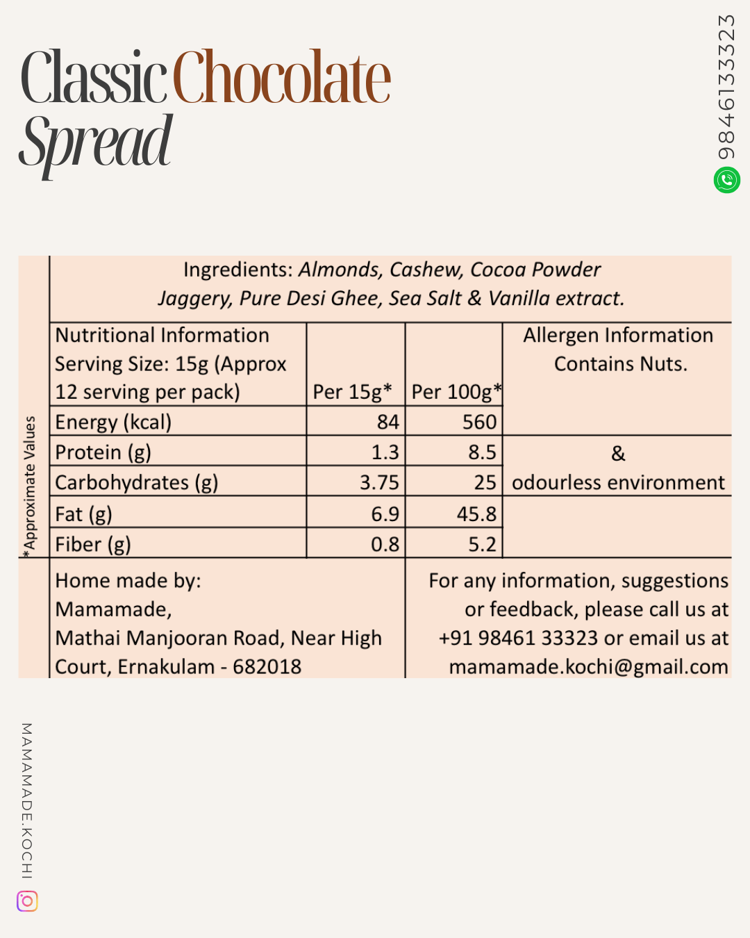 Indulgence meets purity in our Classic Chocolate Spread. Crafted with pure nuts, slow-roasted for depth of flavour, blended with jaggery for natural sweetness, and enriched with pure desi ghee, it delivers a velvety, melt-in-your-mouth richness without compromising on health.Perfect on toast, swirled into smoothies, or enjoyed straight from the spoon, this spread brings guilt-free joy to every bite.