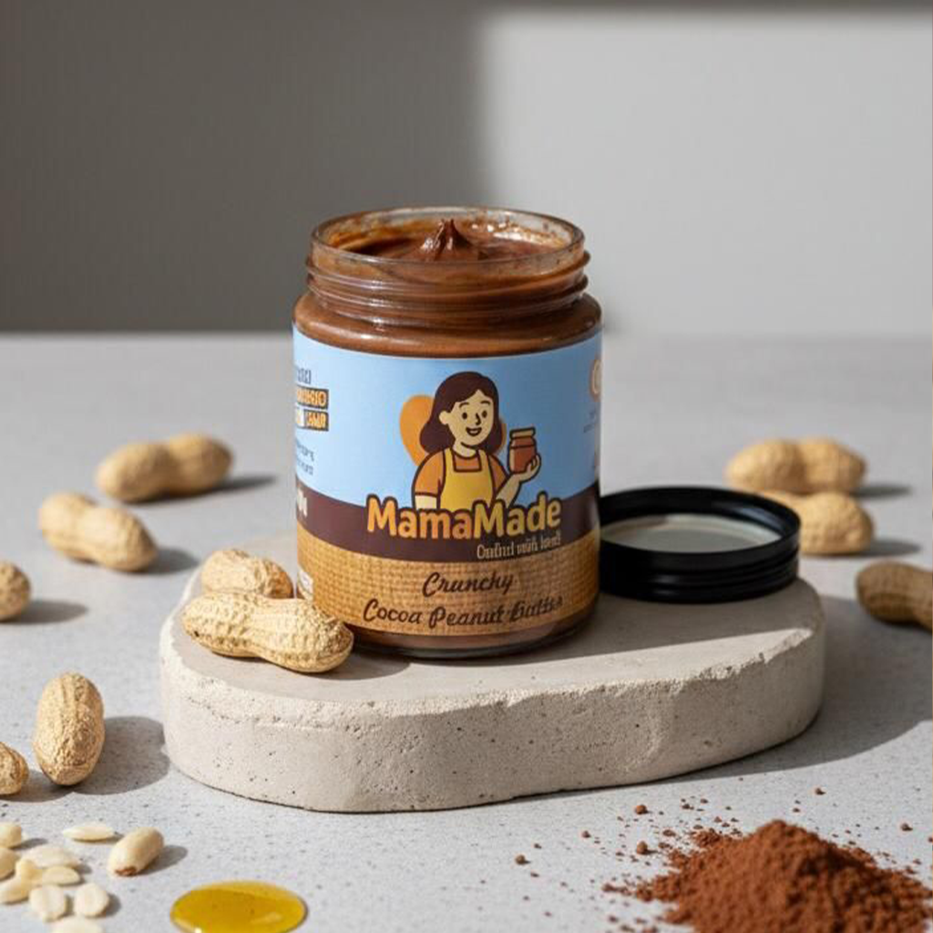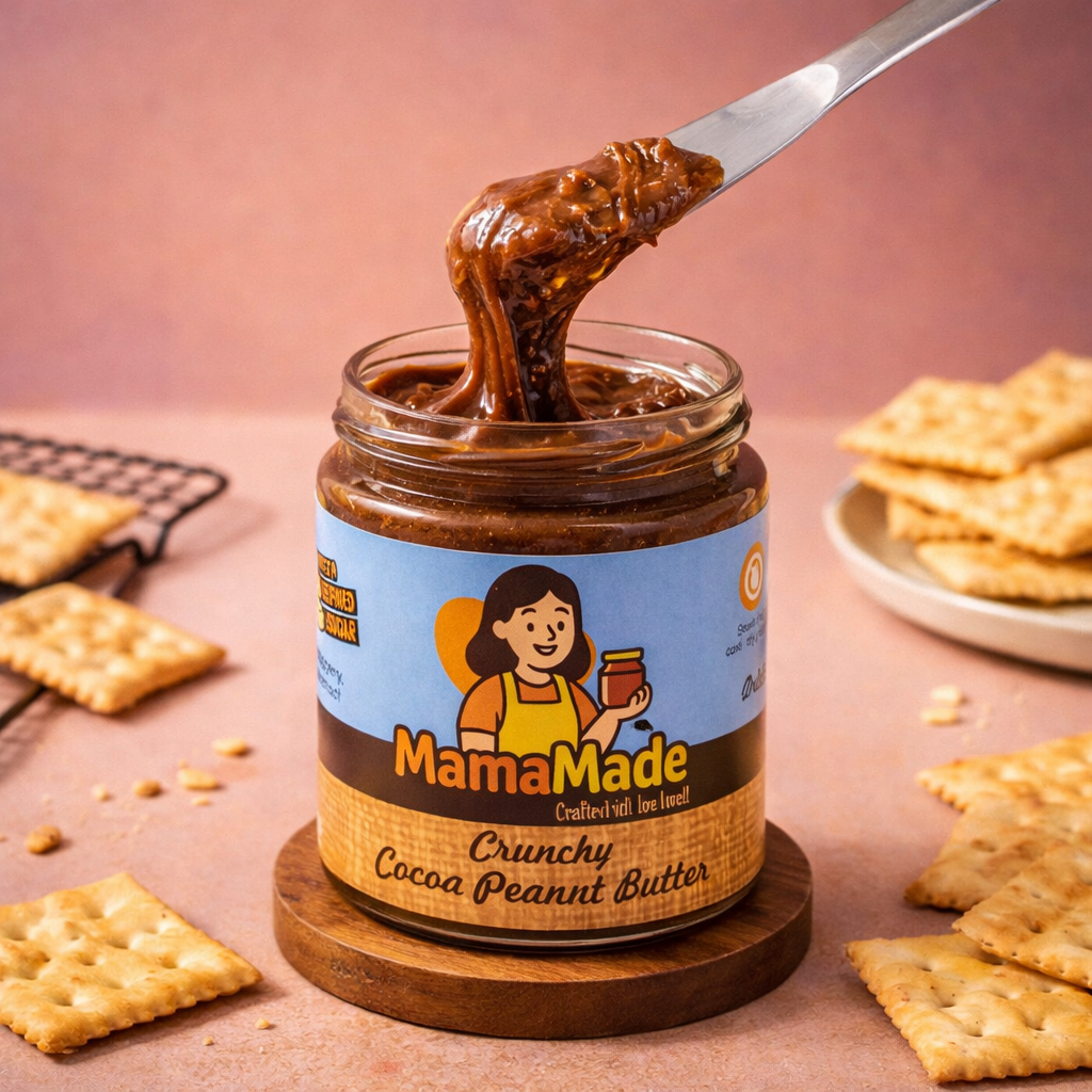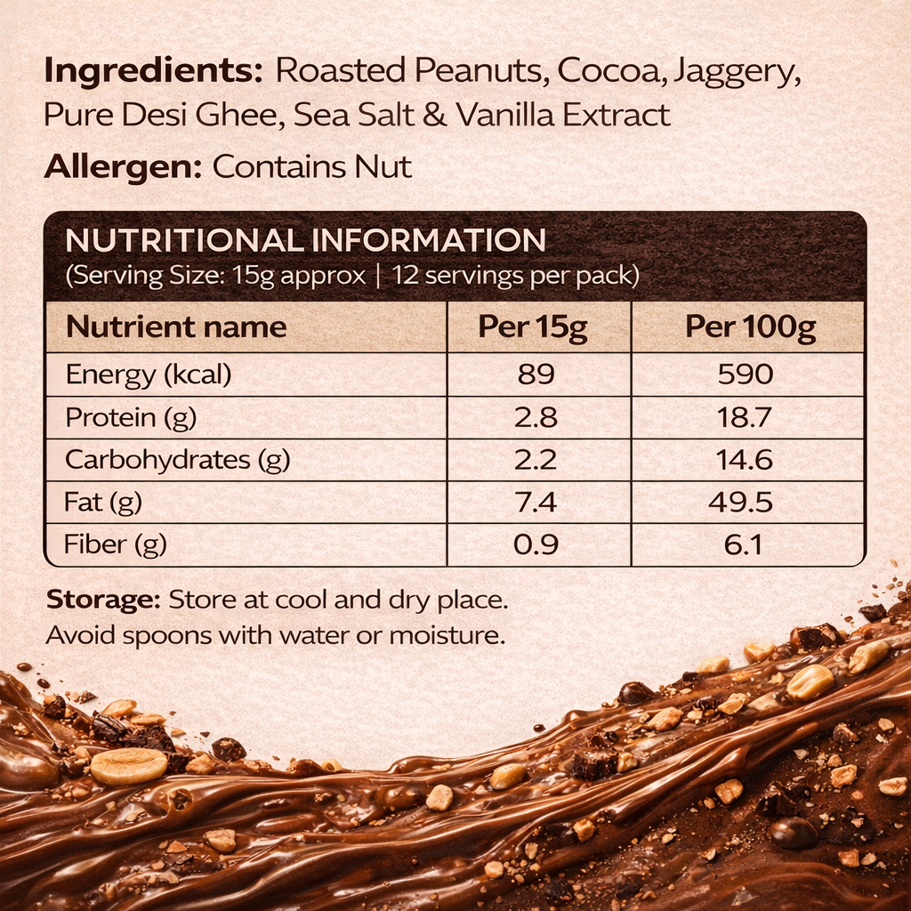 Our Crunchy Cocoa Peanut Butter combines the bold nuttiness of slow-roasted peanuts with rich, chocolatey cocoa for a flavor that feels indulgent yet wholesome. A touch of jaggery adds natural sweetness, while pure desi ghee gives it a smooth, luxurious finish. With the perfect crunchy bite in every spoonful, this spread turns everyday snacking into something truly satisfying.