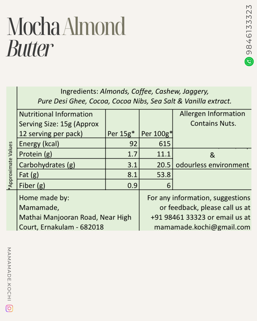 Almonds, Coffee, Cashew, Jaggery, Pure Desi Ghee, Cocoa, Cocoa Nibs. Sea Salt & Vanilla extract