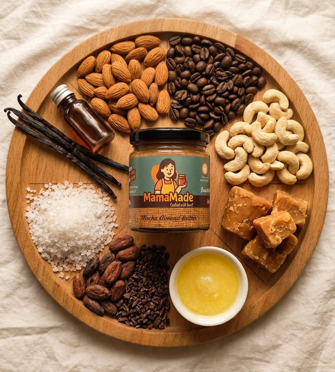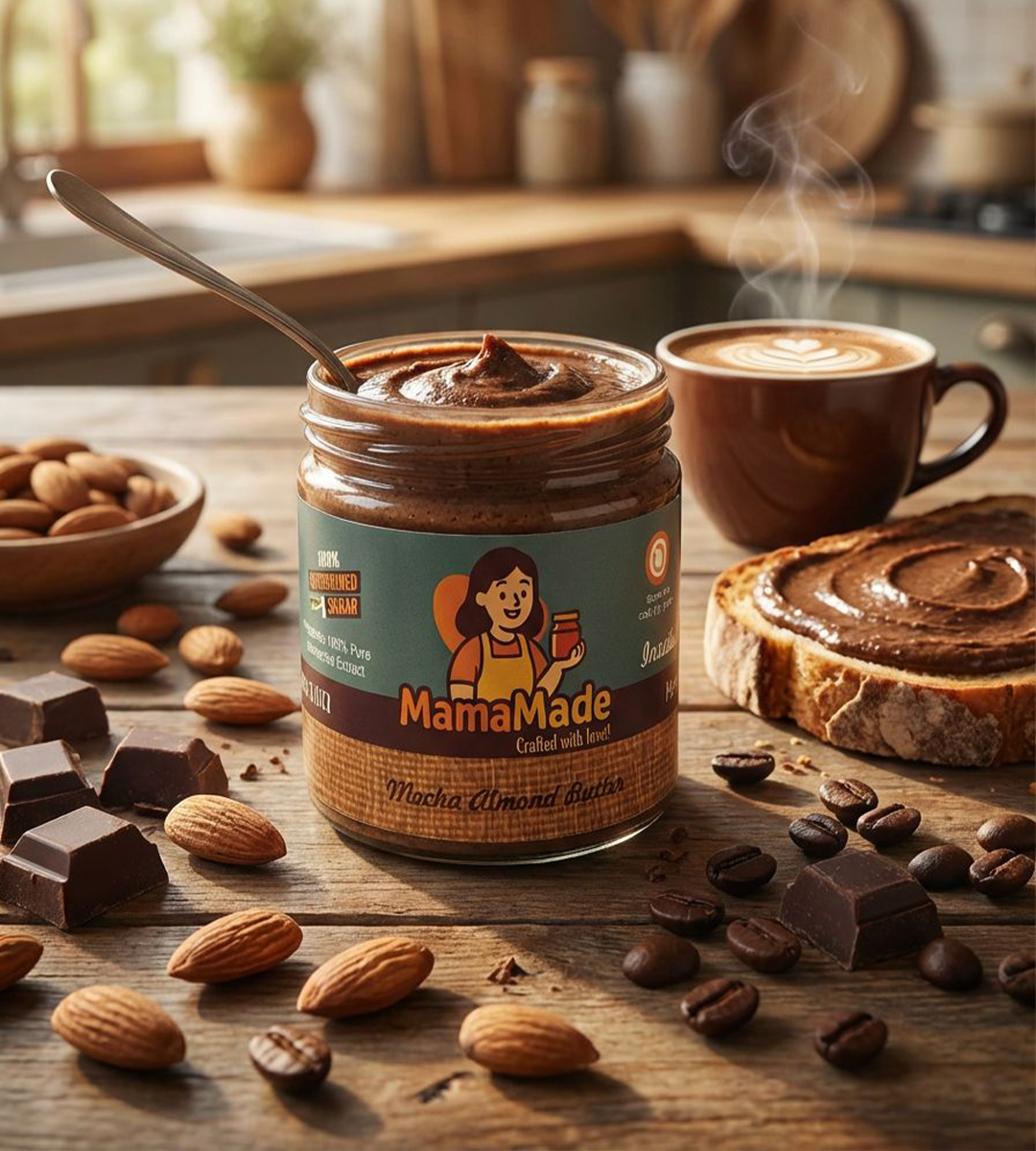 Where coffee lovers and chocolate lovers meet. Our Almond Mocha Butter blends slow-roasted almonds, rich cocoa, and a hint of coffee for a bold, aromatic flavour that tastes like a café-style mocha in a creamy, nutty jar. Smooth, indulgent, and naturally sweetened with jaggery, it’s the kind of spread that makes mornings magical—and spoons irresistible.